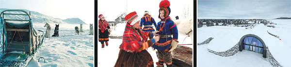 | From left: Dogsledding is one of the winter attractions of Northern European countries; the indigenous Sami people in Sweden; Icehotel 365 in northern Sweden’s Jukkasjarvi village. Photos Provided To China Daily |