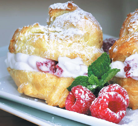 To make the filling: Just before serving, whip cream with 1 tablespoon powdered sugar until it holds a soft peak. Reserving a few whole raspberries for garnish, lightly crush the rest with a fork, then fold into the whipped cream. Cut puffs in half horizontally with a serrated knife, fill bottom half with cream and replace top. Sift with powdered sugar and garnish with remaining raspberries.