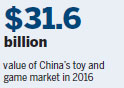 In China, the total toy and game market was worth 218 billion yuan ($31.6 billion) in 2016. Traditional toys and games accounted for around 70 billion yuan, according to Euromonitor.