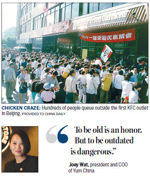 "We have been here so long that sometimes Chinese consumers may outgrow us a little bit. We need to adjust and keep up," said Joey Wat, president and chief operating officer of Yum China, the parent company of KFC that recently split from its global business Yum Brands to become a separate publicly traded company.