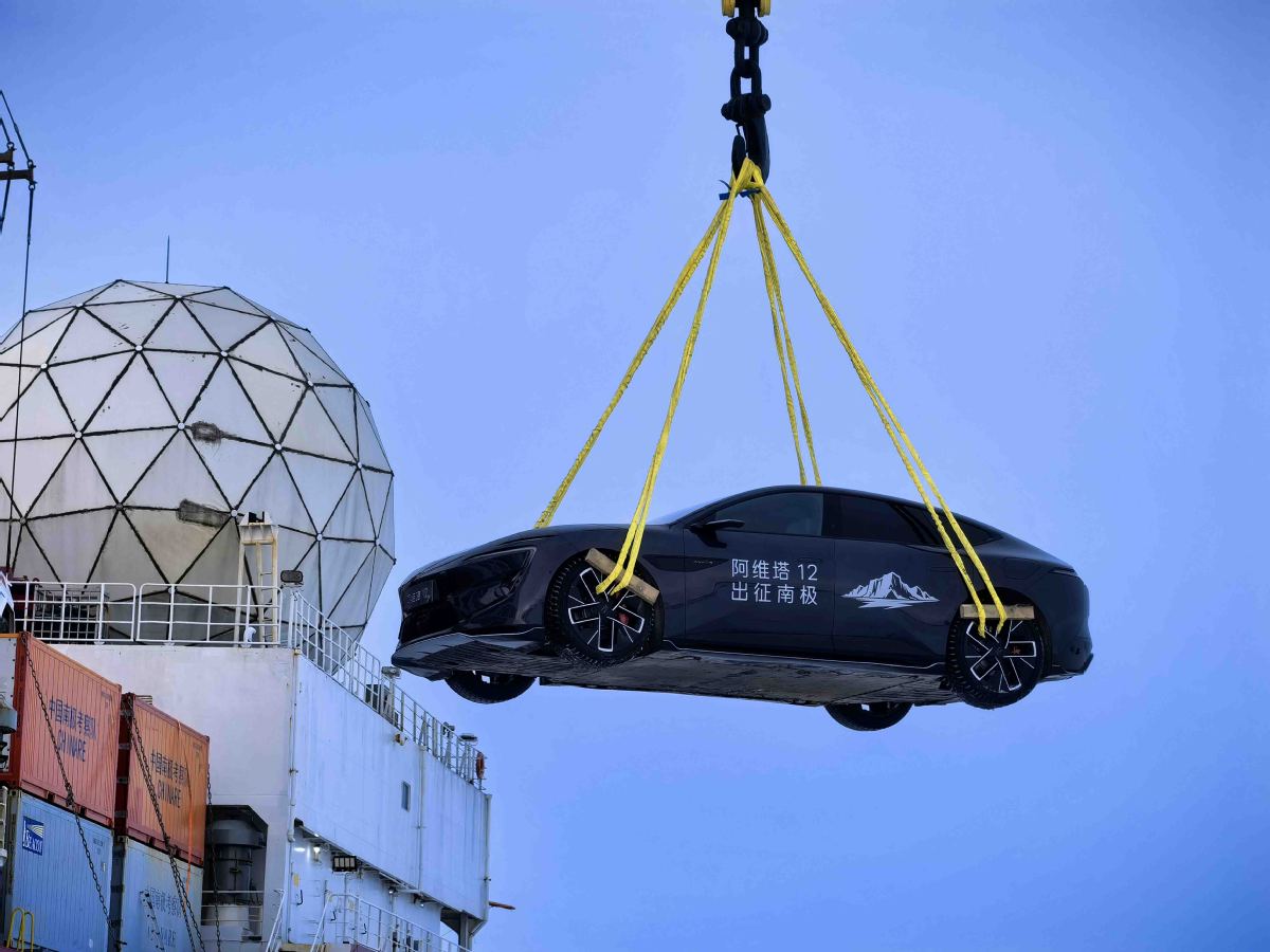 At 6 am (Beijing time) on Dec 7, an AVATR 012 luxury sedan, manufactured in Chongqing, was gently lowered onto the Antarctic ice sheet from the polar research vessel  Xuelong, marking the beginning of its polar testing mission at the Antarctic Central Station. It is the world's first NEV to set foot on the frozen continent. [Photo provided to chinadaily.com.cn]