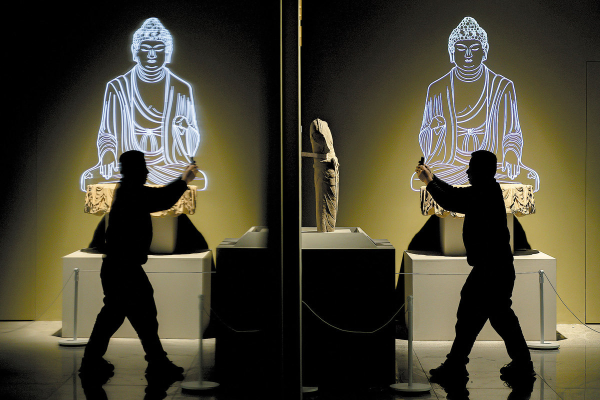 A visitor focuses on a Tang Dynasty (618-907) Buddha statue at the Fusion and Evolution — Stone Carvings of Nannieshui exhibition in the Shanxi Museum in Taiyuan on Dec 16, 2025. HU YUANJIA/FOR CHINA DAILY