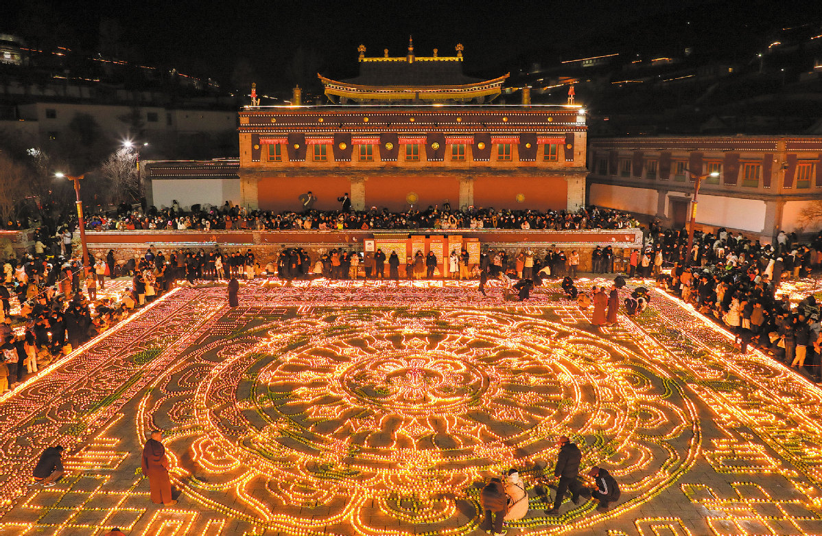 Devotees light butter lamps at the Kumbum Monastery in Xining, Northwest China's Qinghai province, to pray for happiness and good health through the night on Dec 14, 2025. The Butter Lamp Festival commemorates Tsong Khapa, a master of Tibetan Buddhism. The annual festival is observed on the 25th day of the 10th month in the Tibetan calendar. MA MINGYAN/CHINA NEWS SERVICE