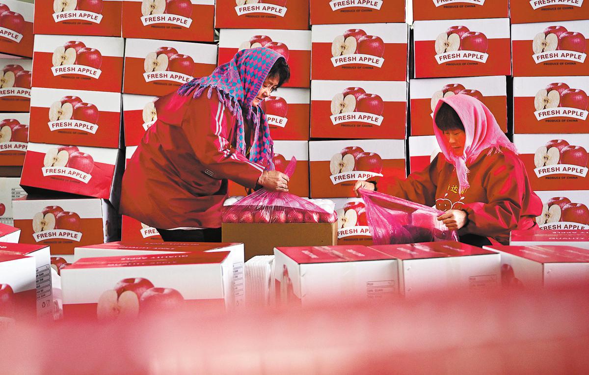 Workers at a fruit trading company pack apples in Zhongzhuang township, Zibo city, Shandong province, on Dec 19. ZHAO DONGSHAN/YOU KUIKUI/FOR CHINA DAILY