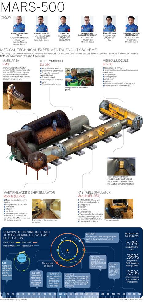 During the 520 days of the experiment, they never left the ground but went through all the simulated experiences of a manned space journey to Mars and back, beginning from June 3, 2010.