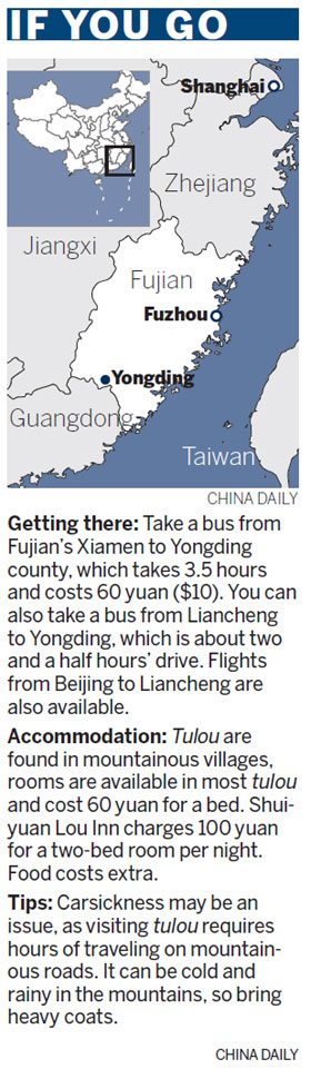 There's a joke about tulou, the distinctive homes of Hakka people in Fujian province, which goes a bit like this: Two men are talking and one of them boasts: "My house is so big, it's four stories high." The other responds: "That's nothing - 300 people live at my place." They continue arguing about who has the bigger house and only later, when they arrive home, do they realize that they actually live in the same place. Tulou means "earthen building" in Chinese and is a large communal building representative of Hakka culture. Most are three or four stories high and accommodate hundreds of people, often with the same surname.