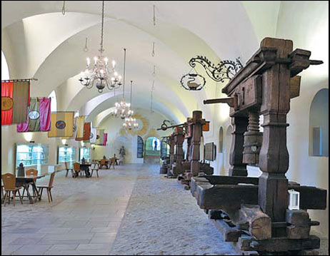 Traditional wooden wine presses are displayed in the museum at Fortress Marienberg in Wuerzburg. |