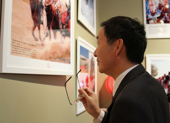 Sun Guoxiang, China's consul general in New York, looks at one of the photos in the exhibit Beautiful Xinjiang, during its opening ceremony on Friday at the Asian Cultural Center in Manhattan. The exhibit, which opens to the public on Monday and will run through Nov 23, showcases the Xinjiang Uyghur autonomous region. It is organized by the Overseas Chinese Affairs Office of the State Council and the New York consulate. |