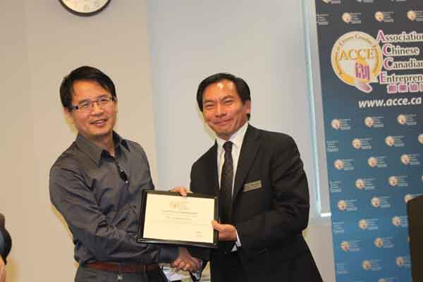 Dr. Songnian Zhou (left), former CEO, chairman and a co-founder of Platform Computing, receives the Certificate of Appreciation from Alan Kwong (right), the president of Association of Chinese Entrepreneurs (ACCE) in recognition of his speech “Learning from the Achievers” on November 15, 2012 at Markham Convergence Centre, Ontario, Canada. As part of the Building a Successful Company Networking Series, the speech was hosted by ACCE in partnership with the Hong Kong Chinese Business Association and the Taiwan Entrepreneurs Society Taipei/Toronto. Zhou shared with the audience his perspective of success as well as his fresh insights of building a strong and growing company. (Photo: Na Li/ China Daily, Toronto) |