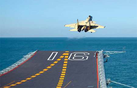 | A J-15 fighter jet takes off from the Liaoning as China's first aircraft carrier conducts successful deck-landing exercises. Li Tang / for China Daily |