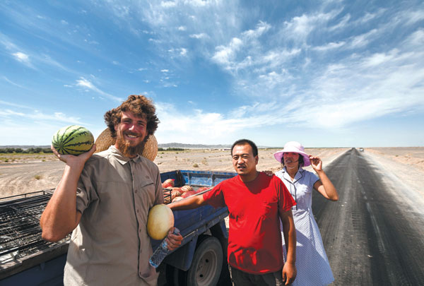 | While walking through the Gobi desert, Rehage often receives watermelons as gifts. |