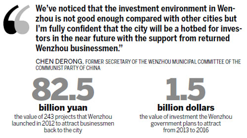 To attract businessmen back to the city, Wenzhou launched 243 projects in 2012 with a total investment valued at more than 82.5 billion yuan. Wenzhou businessmen away from the city invested over 66.5 billion yuan in 207 of those projects, with overseas merchants contributing over 2.43 billion yuan.