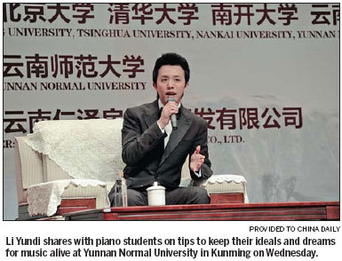 As the seventh speaker at the Southwest Associated University Forum, Chinese pianist Li Yundi performed a solo concert and offered advice to young piano students on how to keep their ideals and dreams for music alive at Yunnan Normal University in Kunming, capital of Yunnan province.