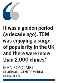 "It was a golden period. TCM was enjoying a surge of popularity in the UK and there were more than 2,000 clinics," says Man Fong Mei, chairman of the Chinese Medical Council UK and president of London-based Mei's Group, which operates a series of herbal clinics and TCM shops across the UK.
