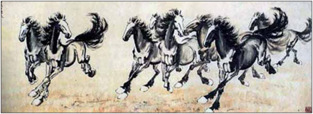 Xu's portrayals of horses galloping or trotting past, in a rich variety of poses, are some of the most captivating of their kind. Using mostly black ink, they combine the best methods from East and West. The lines and brush strokes are simple, yet invariably evoke the essence of the animals.