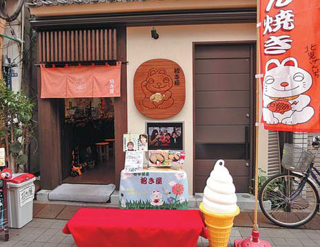 | A shop on Yanaka Ginza shopping street selling the traditional beanpaste-filled cakes in the shape of a cat. |
