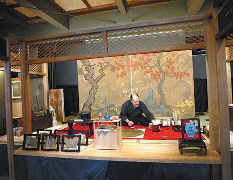 | Artist Allan West uses traditional pigments in his works. Only nine stores remain in Japan that sell the paints and four of which are in Yanaka. |