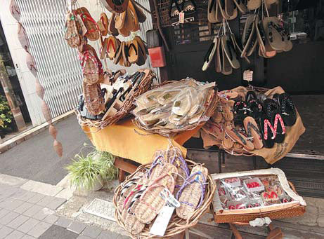 | A shop on Yanaka Ginza shopping street selling traditional wooden and rope sandals. |