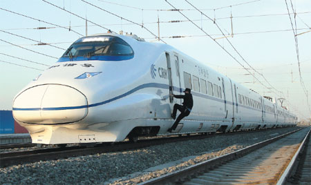 | A test-running bullet train at the Hami station in Xinjiang Uygur autonomous region. The high-speed railway from Lanzhou, Gansu province, to Urumqi, Xinjiang, is expected to go into service at the end of this year. Polat Niyaz / China Daily |
