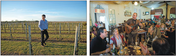 | From left: Bernardo Marzuca, the owner of El Legado winery, walks through his property in the Carmelo area, a region in the southwest part of Uruguay, near Argentina, that has been producing wine for generations; bottles of tannat wine at El Legado. |