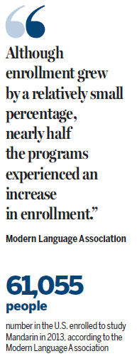 The number of Americans learning Mandarin is slowly but steadily increasing. A survey by the Modern Language Association shows that enrollment in Chinese language learning in the United States went from 59,876 in 2009 to 61,055 in 2013, an increase of 2 percent.