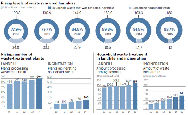 In 2014, 179 million metric tons of household waste was collected nationwide, according to data provided by the National Bureau of Statistics. Meanwhile, statements released by the central government say the volume of waste is expected to grow at between 7 and 10 percent every year in large cities, such as Beijing.