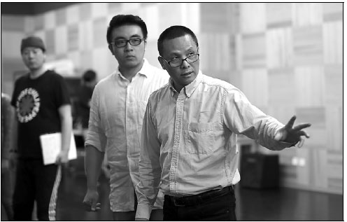 | Yi Liming (right) instructs actors at a rehearsal in Beijing. The director has been engaged in ambitious projects to present diverse theater productions to Chinese audiences. |