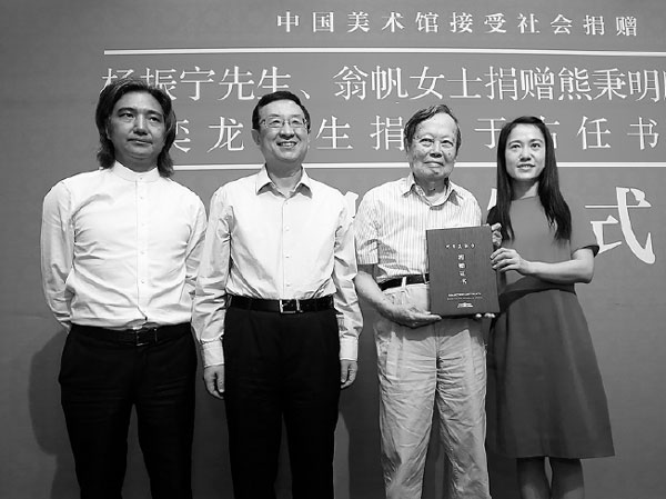 | Yang Zhenning (second from right) and his wife Weng Fan receive a donation certificate from Luo Shugang (second from left), Minister of Culture, and Wu Weishan, director of the National Art Museum of China. Provided to China Daily |