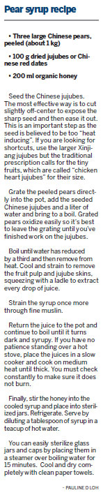 Traditional Chinese cures are all about achieving perfect balance in the body and so, different recipes for this pear syrup may also include ginger for heat and flavoring and crushed fritillary bulbs to speed up recuperation from coughs.
