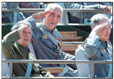 | Retired Major General Zhang Yuhua (center) salutes with his right hand, which was wounded in war, while celebrating the 70th anniversary of the victory in World War II in 2015.Fan Jun / Xinhua |