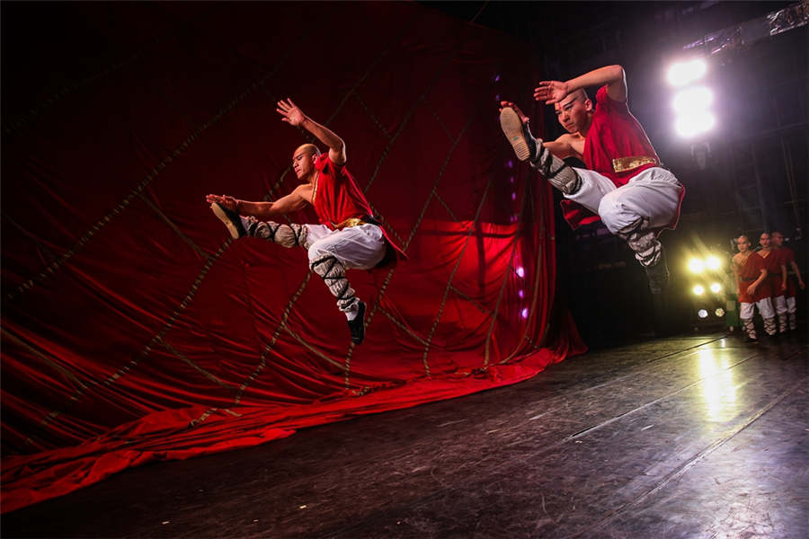 Martial artists warm up before The Legend of Kungfu at the Red Theater in Beijing on Feb 10, 2017. [Photo by Roman Pilipey/cpanet.org.cn]