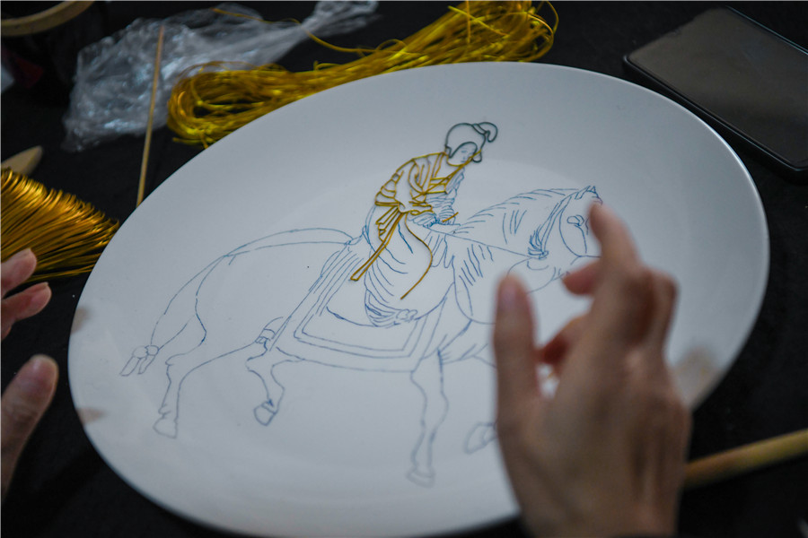 Ouyang Guohui works on a cloisonne enamel painting in his workshop. [Photo by Yang Yikai for chinadaily.com.cn]