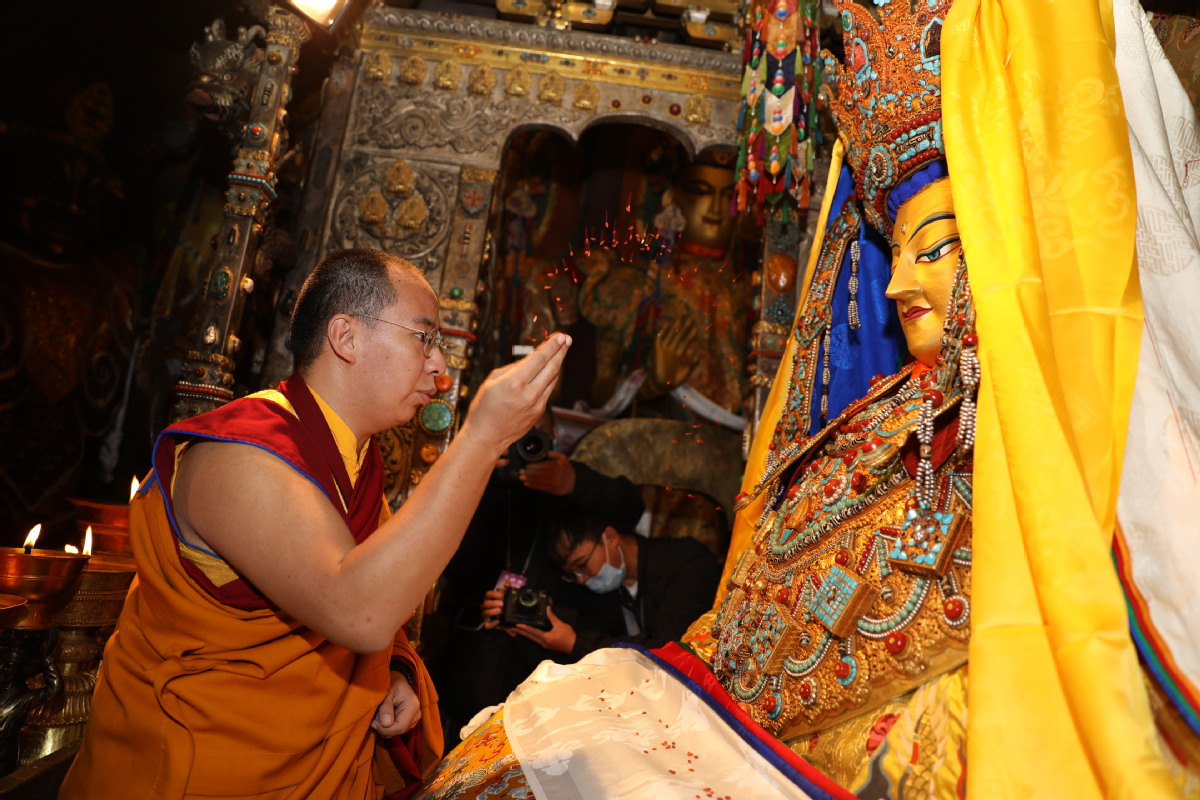 The 11th Panchen Lama pays respects to the statue of the Buddha Sakyamuni in the Jokhang Temple in Lhasa. [Photo by Wang Shu/chinadaily.com.cn]