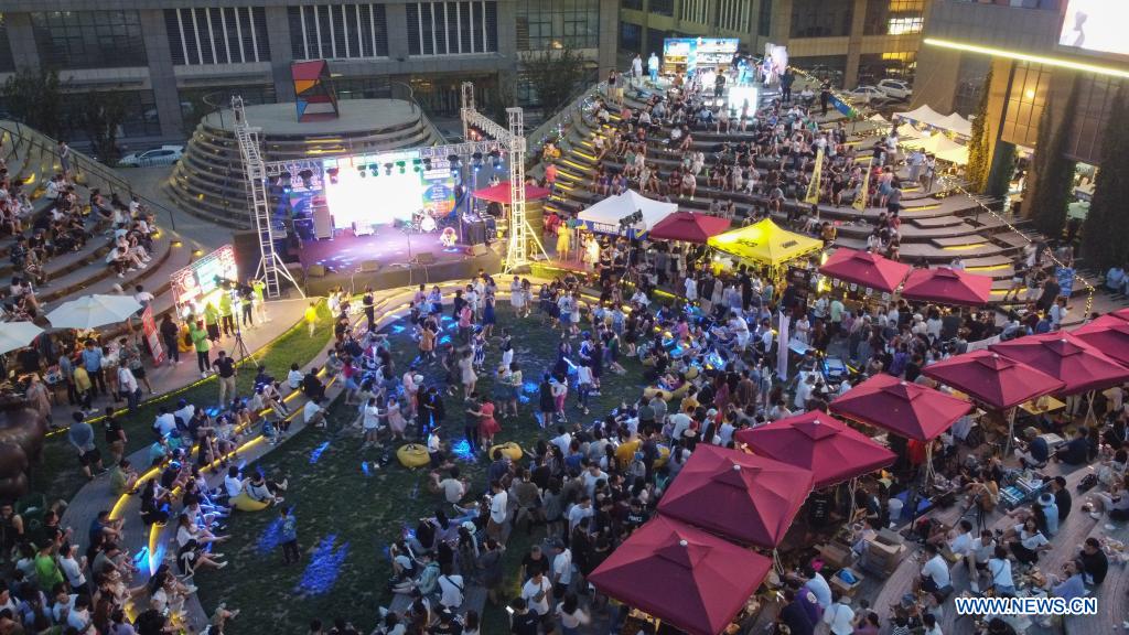 Aerial photo taken on July 10, 2021 shows the venue of a drinking carnival in Xiqing district of North China's Tianjin. [Photo/Xinhua]