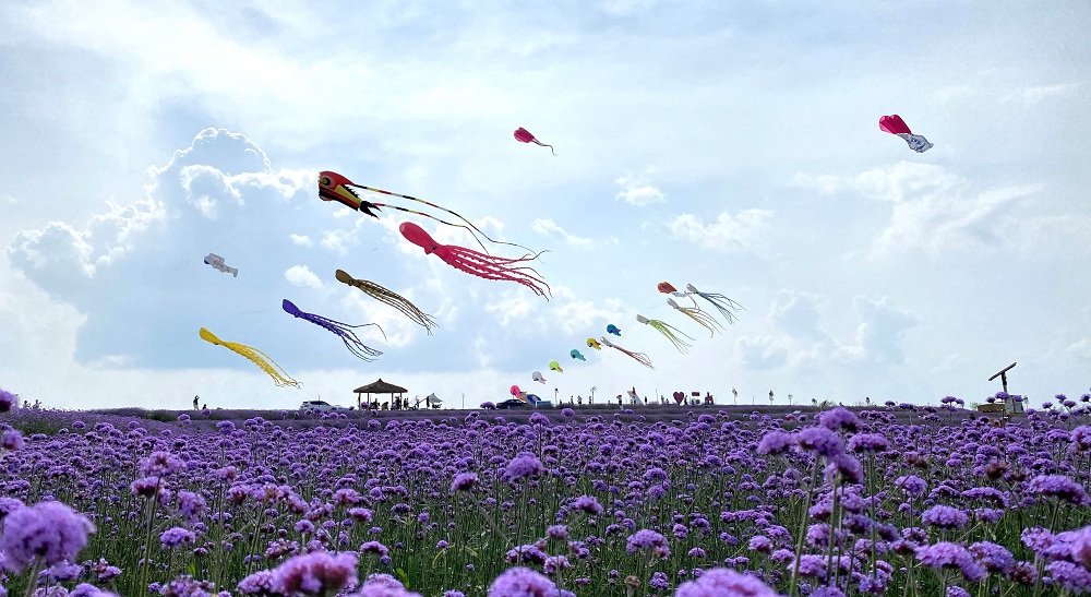 Kites of all shapes and sizes floate over a purple sea of verbena flowers during a kite festival in Guiyang, Southwest China's Guizhou province on Aug 8, enchanting crowds of visitors. [Photo/IC]