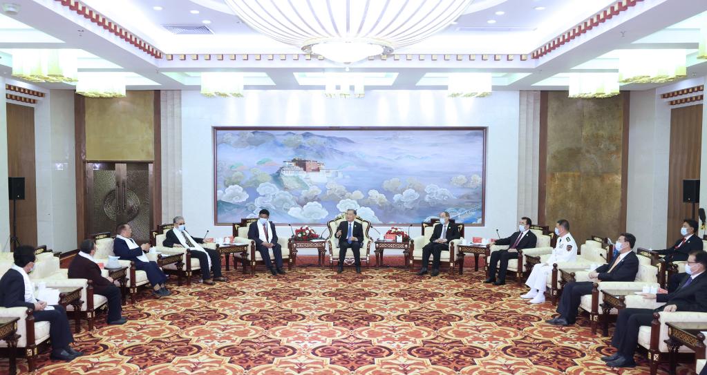 Entrusted by the Communist Party of China (CPC) Central Committee and Xi Jinping, general secretary of the CPC Central Committee, Wang Yang, a member of the Standing Committee of the Political Bureau of the CPC Central Committee and chairman of the National Committee of the Chinese People's Political Consultative Conference, pays a visit to leading officials in Tibet and veteran senior officials, among others, at Lhasa Hotel in Lhasa, capital of Southwest China's Tibet autonomous region. A central delegation led by Wang arrived in Lhasa on Wednesday to attend celebrations of the 70th anniversary of the peaceful liberation of Tibet. [Photo/Xinhua]