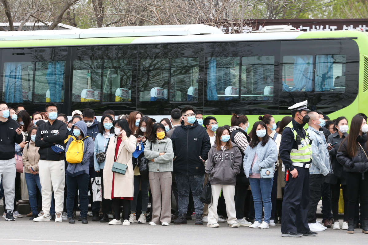 Inter-provincial commuters wait for buses at the Baimiao North general checkpoint. [Wu Xiaohui / China Daily]