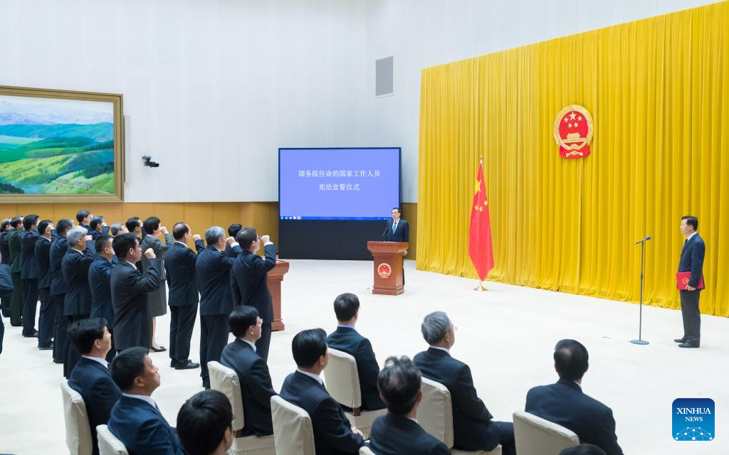 Senior officials of departments and units under the State Council, China's cabinet, take an oath of allegiance to the Constitution at a ceremony in Beijing, July 5, 2022. The ceremony was overseen by Premier Li Keqiang. [Photo/Xinhua]