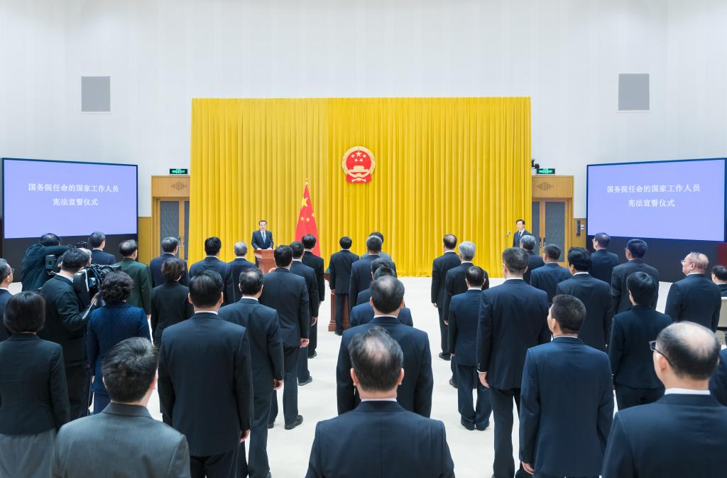 Senior officials of departments and units under the State Council, China's cabinet, take an oath of allegiance to the Constitution at a ceremony in Beijing, July 5, 2022. The ceremony was overseen by Premier Li Keqiang. [Photo/Xinhua]