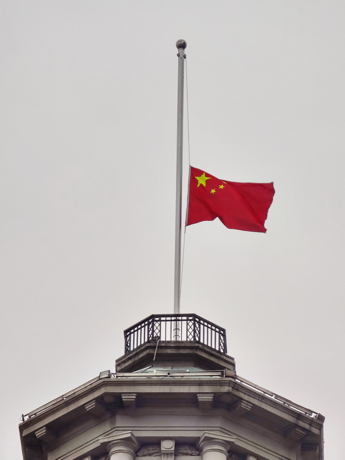 The Chinese national flag is flown at half-staff to mourn the passing of Comrade Jiang Zemin at the Jianghanguan Museum in Wuhan, Central China's Hubei province, Dec 6, 2022. [Photo by Li Changlin/for chinadaily.com.cn]