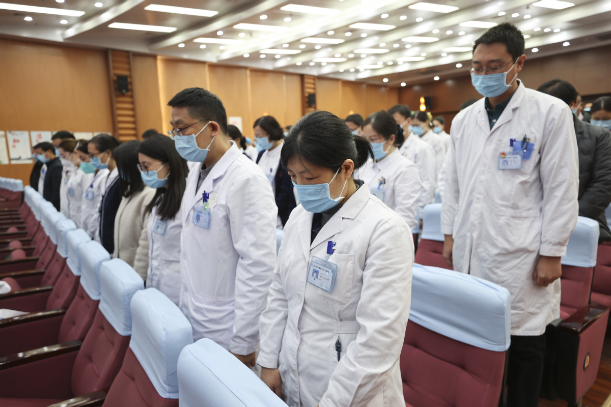Medical staff members pay a silent tribute to Comrade Jiang Zemin in Lianyungang, Jiangsu province. [Photo by Si Wei/for chinadaily.com.cn]