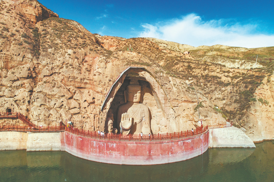 While the exact cave resulting from the king's devotion to his mother remains unknown, it is certain that this place became a center of grotto carving, a practice that flourished for centuries to come. An early spring visit, just an hour's drive from Wuwei's city center, brings visitors face-to-face with a magnificent reflection of the legacy: a massive south-facing, 30-meter-high sandstone statue of Shakyamuni Buddha dated to the Tang Dynasty (618-907).