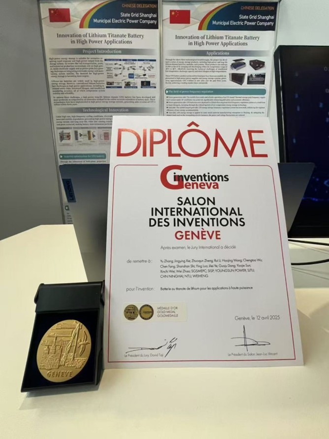 The State Grid Shanghai Electric Power Research Institute has won a gold medal at the 50th Geneva International Invention Exhibition for its "Innovation of lithium titanate battery in high power applications," organizers announced on Sunday.