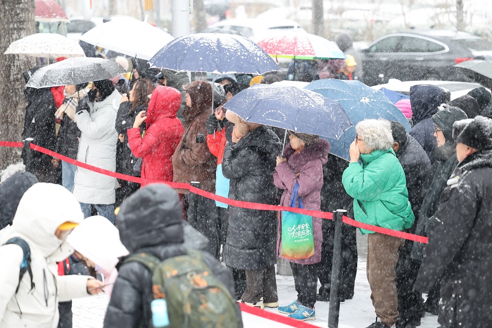 Parents wait for their children outside a school amid snowfall in Haidian district, Beijing, Dec 12, 2025. [Photo by Feng Yongbin/chinadaily.com.cn]