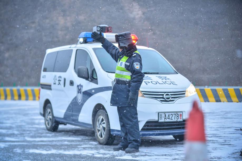 At an expressway checkpoint in Mentougou district, police officers and auxiliary police work in the wind and snow to ensure the safe and smooth passage of travelers. [Photo by Wang Hanyi/provided to chinadaily.com.cn]