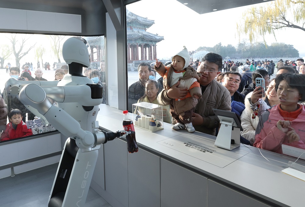 A robot retail store at the Summer Palace in Beijing draws a large crowd of tourists in November. The store is operated by robots that independently provide a full-process service including reception, ordering, payment, pickup and delivery, selling beverages and park cultural and creative products. [Photo by Zou Hong/chinadaily.com.cn]