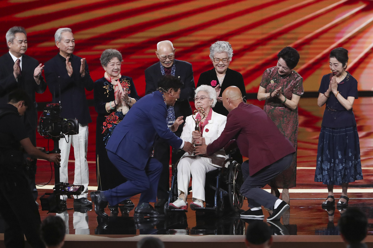 Veteran performing artist Tian Hua receives the Lifetime Achievement Award for her decades-long devotion to cinema at the award ceremony of the 15th Beijing International Film Festival in Beijing, April 26, 2025. [Photo by Chen Zebing/chinadaily.com.cn]