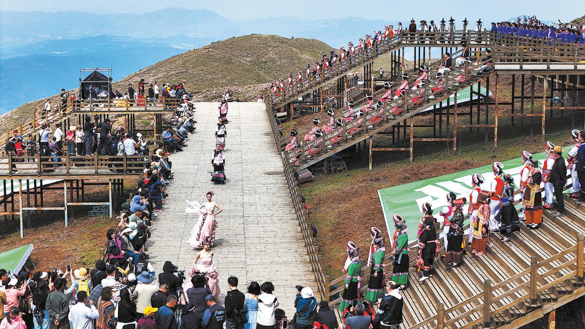 A fashion show is staged at Wumeng grassland scenic area in Guizhou province to promote local tourism on April 20. QIAO QIMING/FOR CHINA DAILY