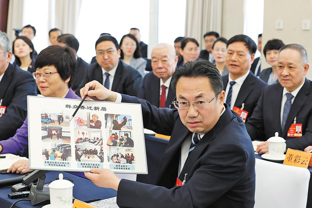 He Dong (front), a deputy to the 14th National People's Congress, details post-earthquake reconstruction efforts in Jishishan county, Gansu province, at a meeting during this year's two sessions, on March 7. In December 2023, a magnitude 6.2 earthquake struck Jishishan. KUANG LINHUA/CHINA DAILY
