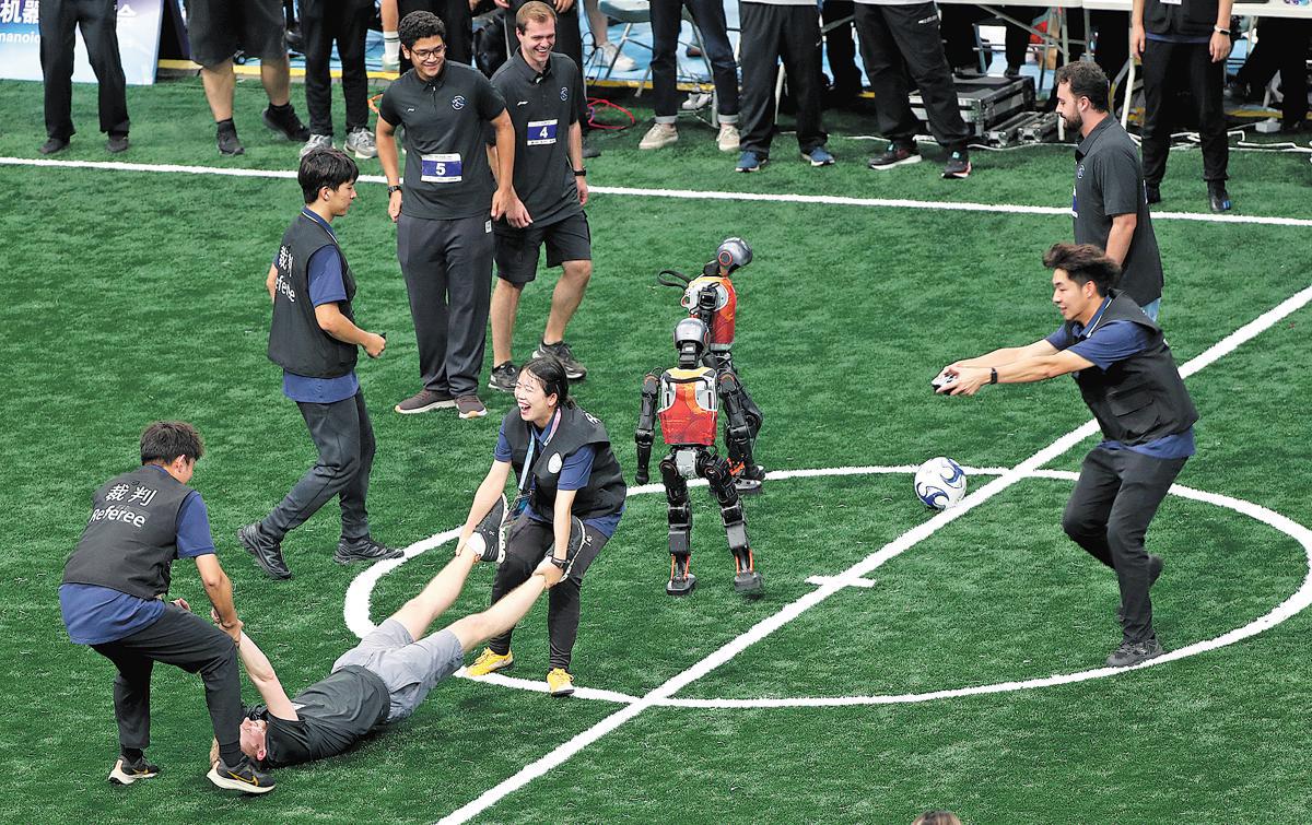 At the 2025 World Humanoid Robot Games in Beijing, a human player imitates a malfunctioning robot that needs to be moved off the field by referees after being knocked down by a robot during the human vs robot soccer match on Aug 17. ZOU HONG/CHINA DAILY